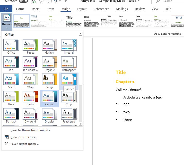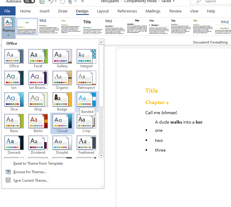 - Theming. If you’re using Word’s style functionality, then you can use the themes stuff under the Design ribbon. And, yes, you can define your own theme design. This is pretty much the same as the CSS styling for HTML documents.