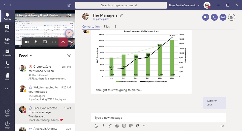 - Chat – This is where the one-on-one conversation happens and where most of the time I spend in Teams happens. Any chat can be turned into a voice or phone call.