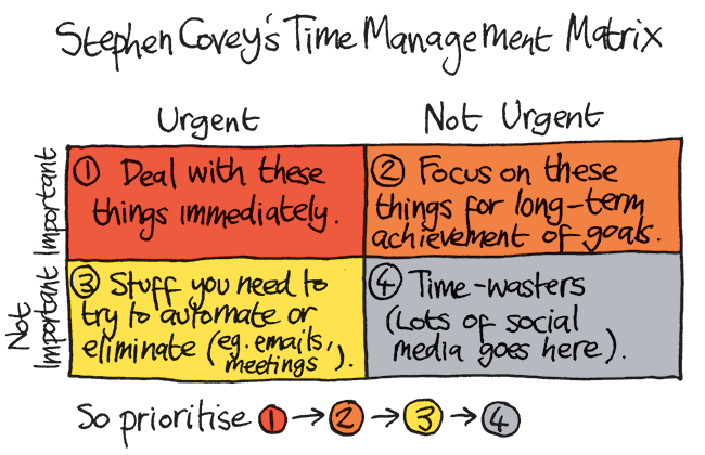 Looking at a heap of work? Do the Important and Urgent stuff first. Then work on the Important stuff. Then work on the Urgent and less Important (because, you can’t ignore it forever). And do whatever you can do to drop the not Important and not Urgent. Or at least give it the squinty side-eye and ask if that’s the really most important thing to do.